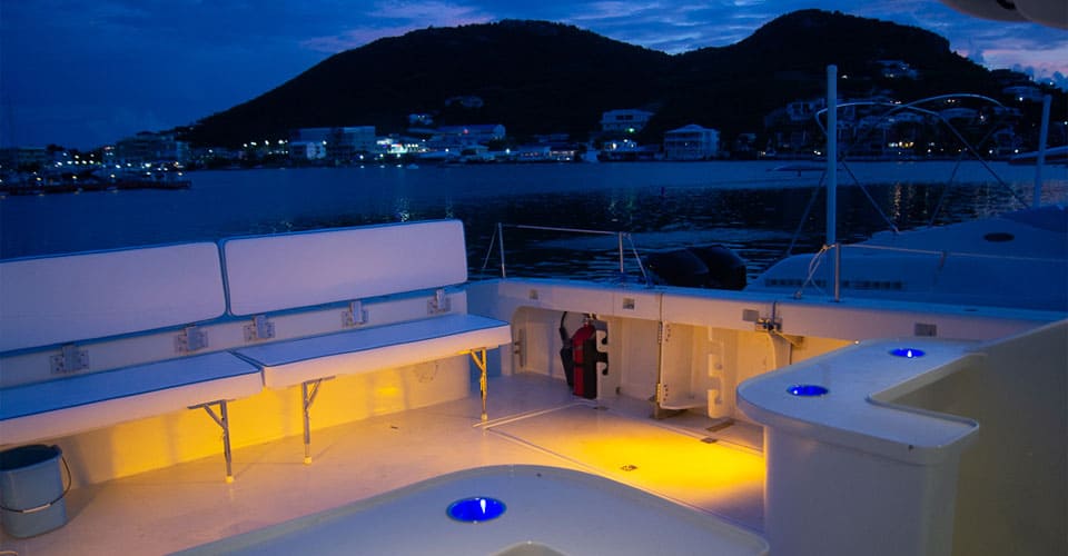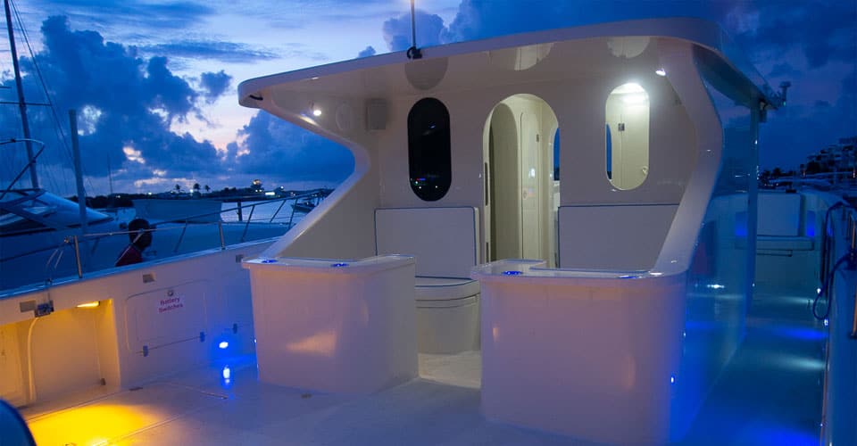 Our flagship vessel, Blu Bi U, is a 38ft Power Cat with a 14ft beam (width). Much more stable and comfortable than your typical monohull.